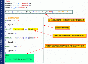 BMI檢測 (3):計算bmi及等級判定 教學課程 - 2010-04-13 - 0 Comments 注意需求敘述中對於 bmi 的判定範圍會造成邏輯上的錯誤。 雖說如此,但這是經常見到的情況,程式設計人員必須對於邏輯的判斷,有更強烈的觀念! 正確的範圍寫法,請參考下圖說明 Tags: 0982網際網路程式設計 Share this story