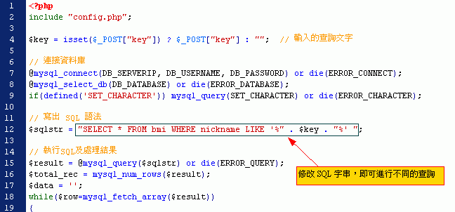 查詢多筆記錄的寫法 教學課程 - 2010-04-14 - 0 Comments 注意:觀念只在 SQL 的字串 find1_x.php 之修改如下圖: Tags: 0982電子商務程式開發 Share this story