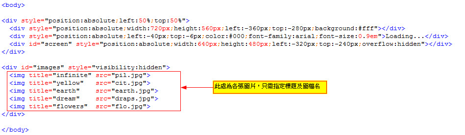 圖片特效教學 (10js-2) 前端技術, 教學文章 - 2011-11-05 - 0 Comments 《Javascript 的圖形特效》一文中的第二種特效如下: 預覽網址:http://study.welcome.idv.tw/b418mm/photo_js/10js/2/ 它的效果為一張張圖片緊接著 zoom-in 或 zoom-out。設定上很簡單,只要指定圖檔名及標題即可,如下: 完成! Tags: 網頁, javascript, 照片特效 Share this story