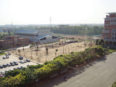 動工後一個多月,已經明顯地看出雛型,也和主任說的相同,那是一處公園綠地,所以我所幻想的運動場所是破滅了。只是不知道完成之後,除了景觀之外,能不能有多一點機能上的設計,至少我再度幻想,可以找學生們討論專題時,能夠約在公園的哪棵樹下,或是在離開學校前,先繞過去找找有無認識且成對的同學們,說聲再見,嚇嚇他們。