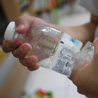 寶寶自己想到的遊戲,把寶特瓶蓋輕輕地蓋上去,然後扭轉瓶身,裡頭的壓力大到一個程度後,瓶蓋就會彈射出去。