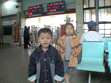 這天本來是要和同事一起去參加『綠色博覽會』的,結果在北宜公路快到宜蘭的下坡處發生車禍,對向來車忽然失控衝向我們,幸好大家都沒事,但是車子撞得蠻嚴重的,無法開了,所以一大群人只好到礁溪車站坐火車回家,之前曾想安排一次火車之旅的(因為小朋友們還沒坐過火車),沒想到竟是這樣的火車之旅,這張照片是在礁溪火車站等車時照的。