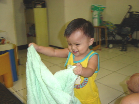 這是大寶的毛巾被被,沒什麼特殊的,就大人的眼光看來,就是一條較厚的大浴巾而已,但大寶的認知是:這就是他的被被,午睡時要蓋這件、外出坐車車時也要蓋蓋、大人哄他睡時,除了塞奶嘴之外,他還會要求蓋蓋……