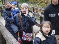 所以後來我們就不敢去餵牛,只有姐姐和哥哥餵。走著走著,大寶還要學阿婆以雨傘當拐杖用。