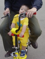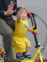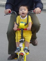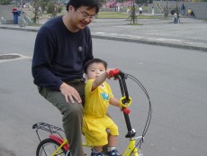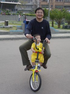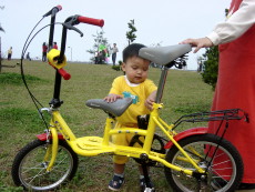 不過現在外圍的公園已規畫完畢,有很大的空間及草坪。爸爸臨時決定把車上的親子腳踏車拿下來騎,就這樣,載著大寶一路呼嘯而過,大寶也興奮地喊:衝呀衝呀……