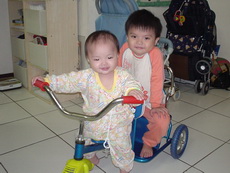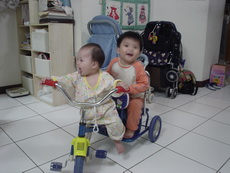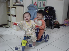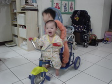 才剛會玩三輪車,就載著寶寶到處騎 (但是注意腳─原來是用腳頂著推呀推地!