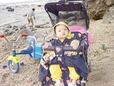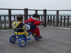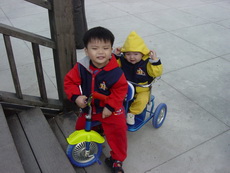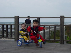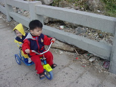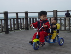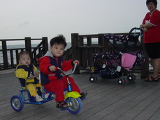 這裡的路其實忽高忽低,所以有幾個學生模樣的年輕人,看到我們帶著一台雙人娃娃車,又再加上一台雙人腳踏車,時而推,時而騎,時而抬,嘴裡說著『還真累呀』,話語傳到爸爸耳裡,心想:他們怎麼能體會我們這種辛苦的樂趣哩!