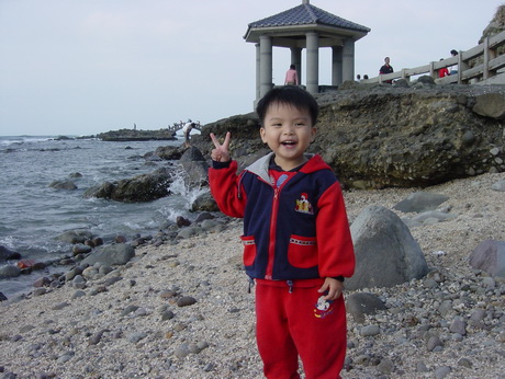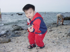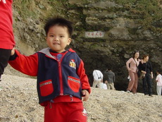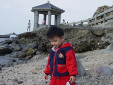 寶寶仍舊騎車載著蓉蓉,沿著一條步道,到了石門洞的景點,之前是一片貝殼加白沙,不少人在此挖沙及抓xx (大概是螃蟹或小蝦吧),寶寶也吵著要挖沙。跟他說沒帶挖沙的東西來,他又吵著要馬上回家拿,再馬上過來挖