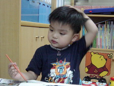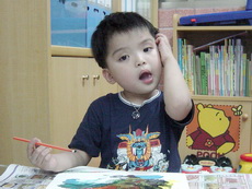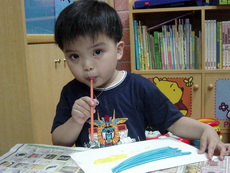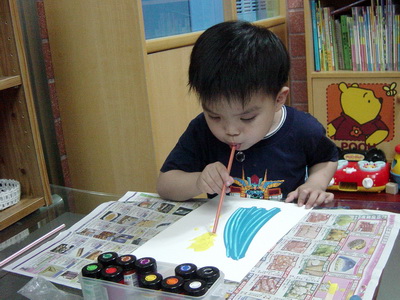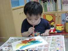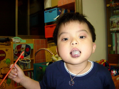 作畫到一半,只見寶寶伸出舌頭,張嘴阿阿阿地叫著,爸爸這才發現,寶寶已經滿舌頭的顏料了。本來已為他把吹畫弄成『吸畫』,再仔細檢查吸管,中間還是乾乾淨淨的,這才發現,原來吸管的一頭是用口吹,另一頭是接近顏料,也難免會直接碰觸到紙張而沾上顏料,而寶寶一不小心就把吸管拿錯頭了!
