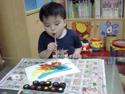 這天 Disney channel 的動手玩創意教『吹畫』,這種帶點玩樂性質的創作,自然吸引寶寶也要自己做一張。準備了吸管和廣告顏料後,便開始動手做………錯了,是"動口吹"!