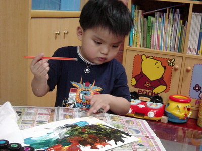 最後再讓寶寶自行挑選顏料,他最喜歡的黑色是絕對要用的。黑色一畫上去,最早用的黃色好像就看不到了。