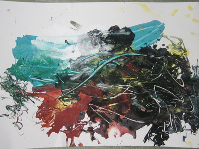 這後的完成作品,其中有些部份已經不只是吹畫了,而是拿著吸管在上面刮來刮去,而刮出來的白色痕跡。問寶寶這張畫的是什麼,他說這是『怪物』