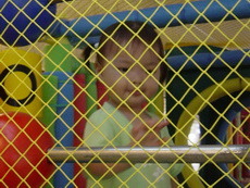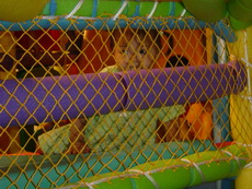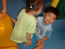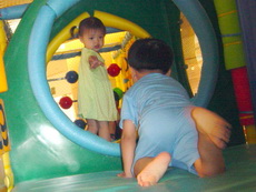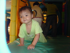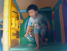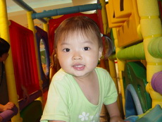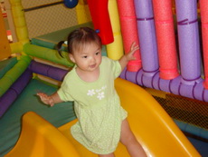 會到京華城玩的原因,幾乎固定都是因為下雨,還有不想跑太遠。這次是蓉蓉第一次在童星城裡玩,好像也是首次玩這類型的遊樂設施。幾乎還找不到像她這麼小的小朋友在玩,可是她玩得可不馬虎,不但樓梯自己爬上爬下不害怕,連溜滑梯也是毫不考慮地就留下來了。記得之前寶寶可是經過好長時間的思索,才小心翼翼地、慢慢一點一點地用手撐著往下滑。看來叫寶寶要照顧蓉蓉,真是多餘了。