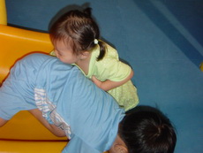 更誇張的是,原本大家都從溜滑梯上往下滑,而蓉蓉率先從底下往上爬,完全不理會爸爸的制止聲。就這樣,眼睜睜地看她慢慢逆向走上溜滑梯,再轉身溜下來,而之後,就是一堆小朋友跟著逆向往上爬了!