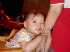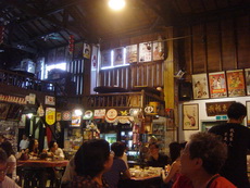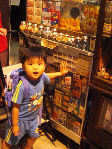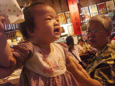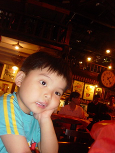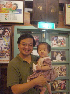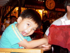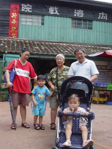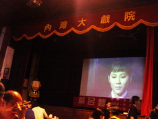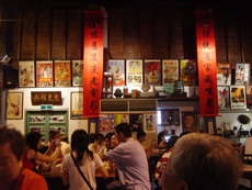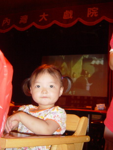 我們在內灣大戲院內用餐,它標榜著用餐可免費看電影,我們便在懷舊的環境內吃飯,還挺有意思的。電影當然也是老片,只不過是用最新的DVD及投影機投射到畫面上,畫質真是太好了。爸爸對一扇門上的橫匾很有興趣,它上面的文字是『太太怕我』,不過媽媽好像是從另一個方向唸過去的…