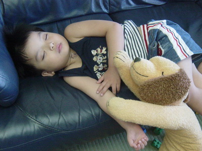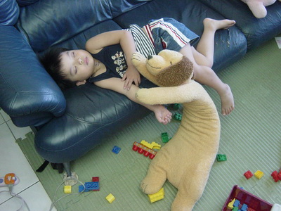 寶寶通常都晚睡,所以早上起床也就比較晚。平常日子因為要上學,都是在睡夢中被媽媽叫起來,而假日就會睡得比較晚了 (正確的說法應該是…媽媽就會睡得比較晚了)。今天寶寶不到六點就起床,不肯再睡,說要到客廳玩,結果玩了不到十分鐘,就倒在沙發上睡著了。