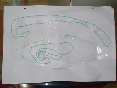 接著,用剪刀把這形狀剪下來,圖中底下近似橢圓的一塊是寶寶剪的,而上面那一長條是寶寶一直要爸爸一起玩,堅持要爸爸剪 (因為是爸爸剪,所以刻意保留寶寶所繪的綠線)。然後,他就用膠帶把這兩張圖貼在另一張紙上,然後就完成了下面這個作品。照例,他把這作品貼在櫃子上展示。