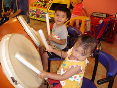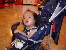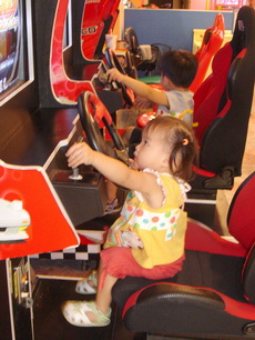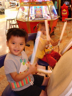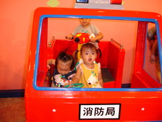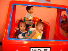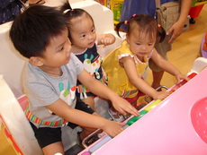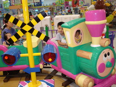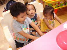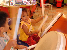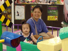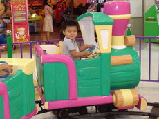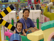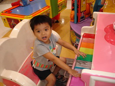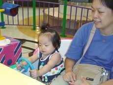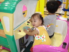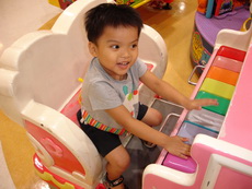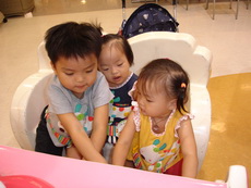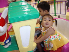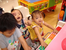 到特易購去吃飯,它在小吃街裡還設有不少兒童遊樂的設施,吃飯時還有專門給小朋友的椅子,更好玩的是,那個椅子底下還有輪子,所以媽媽把小潔放進椅子後,就直接推呀推地。