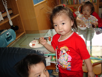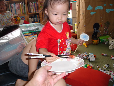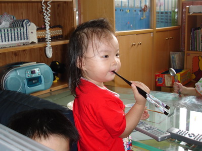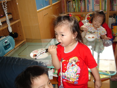 因為覺得時間還沒到,所以也沒急著要訓練蓉蓉用筷子,小孩子的模仿及學習能力真不容忽視。