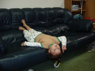 因為蓉蓉會一直要玩背心鈕扣,所以只好讓她反穿。約在兩年前,寶寶也差不多是蓉蓉這麼大的時候,也經歷過一段要背心反穿的時候 (請詳見