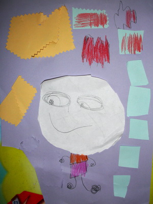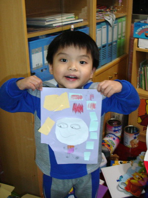 晚上寶寶在畫畫,又拿著剪刀和紙一直在剪,爸爸看他玩得很起勁,就拿各種可以剪曲線及各種花邊形狀的剪刀讓寶寶玩,結果剪得滿地都是碎紙片。本來以為他只是胡亂剪,結果最後卻拿出整張作品給爸爸看。爸爸問,中間這個人是誰呀?只見寶寶不好意思,小小聲地說:『是我啦~』
