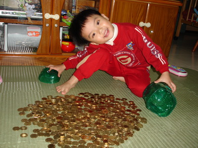 家裡養了一隻豬公,專門吃五十元的硬幣。當時存這隻豬公的目的,就是為了存錢做為出去玩的基金。因為決定過年前要出國去玩了,所以雖然豬公還沒有全部養滿,但也得殺了。