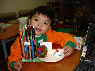 寶寶今天下課回家,帶著在學校製作的勞作作品。這是一個筆架,左邊是用彩色的紙捲成一根一根的長條,圍起來後中間的筒子可以放筆,之前曾看他在家裡捲紙再用膠帶貼起來,想來應該就是在學校做這個作品時,學到的技巧。右邊則在一個松果上面黏上一些彩色的黏土,以及用黏土做的雪人做為裝飾。因為寶寶有自己的桌書,就把這個作品放在書桌前面。