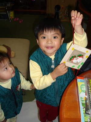 這是寶寶上學期在幼稚園做的勞作,是在過年前做的掛飾,用紙黏土做出的菜頭造型。今天從學校拿回家來,爸爸要幫寶寶拍照留念時,蓉蓉在旁邊看到也吵著要拍照,所以後來就變成蓉蓉拿著照相,但她的方向拿錯了,應該是說,蓉蓉還不知道這個作品的方向是轉45度角的菱形。