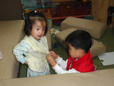 小潔起床後到客廳,寶寶幫忙照顧,把她的衣服穿好,扣好扣子。