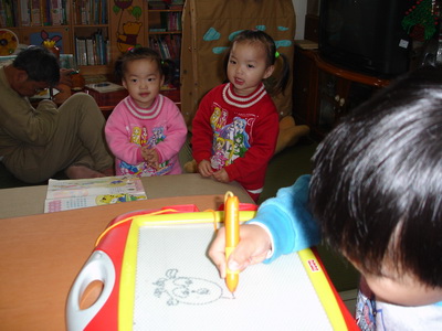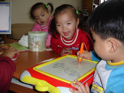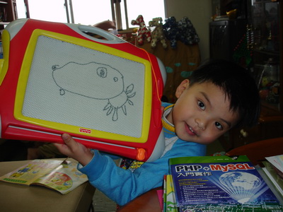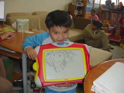 寶寶一時興起,拿起蓉蓉的畫板來畫畫。