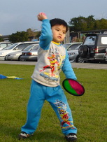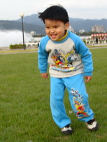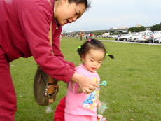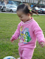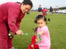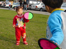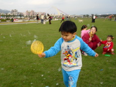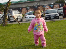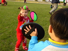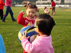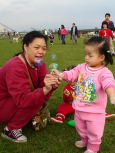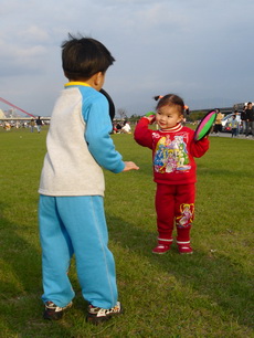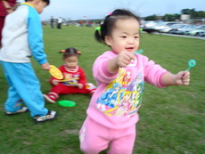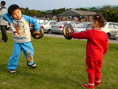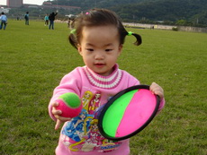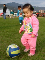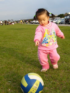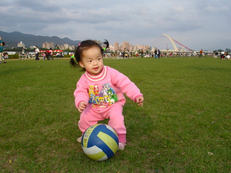 下午到大佳河濱公園跑跑。小潔踢足球,寶寶和蓉蓉則一起玩黏巴球,只要兩個人距離不要太遠,寶寶都可以把球丟進蓉蓉的黏巴手套裡。