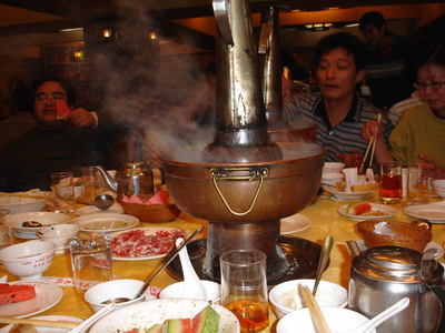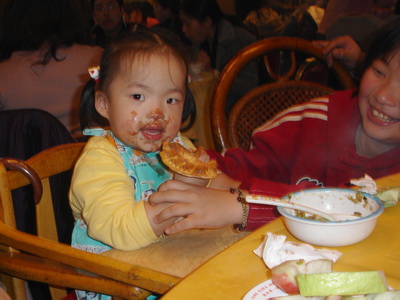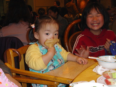 大夥一起去慶祝阿婆生日,到阿姨推薦的蒙古烤肉店─位於松江路上的唐宮。菜色果然很有味道,肉的種類很多,而且因為客人很多,每天的肉都很新鮮,尤其是酸菜火鍋的湯頭,以及夾烤肉吃的燒餅,都令我們讚不絕口,小朋友等著吃的就是冰淇淋了,小潔吃得滿嘴都是。小朋友每個人還得到一個阿婆親手縫製的包包,很漂亮。咦~壽星不是阿婆嗎?怎麼反而是阿婆送大家禮物呢?!