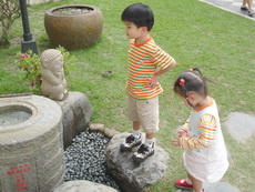 今天通往七寶塔的門有開放,所以我們第一次進到這個區域,裡面有佈置假山的小花園,不過河水的地方是用白色小石頭做象徵。