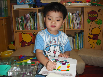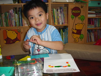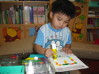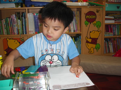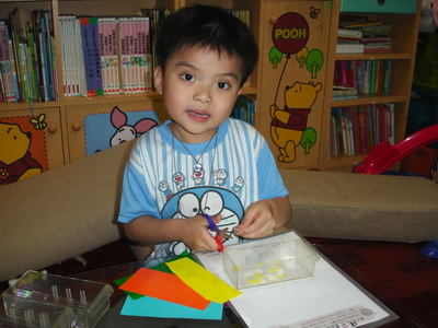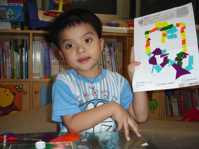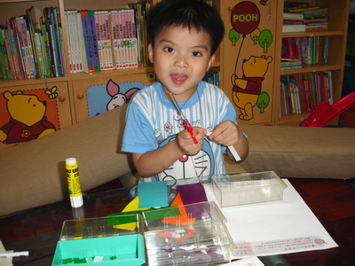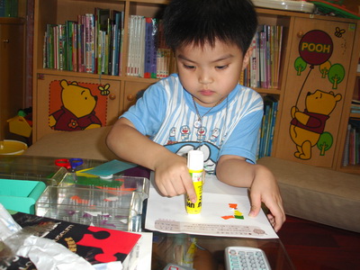 寶寶說要做『計程車』,不過他沒有打算先用筆在紙上畫草稿,直接把紙片拿來就開始貼了。