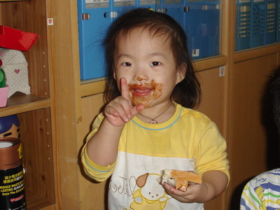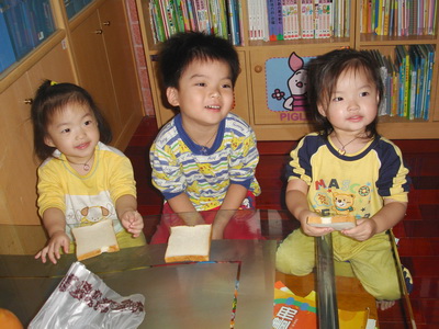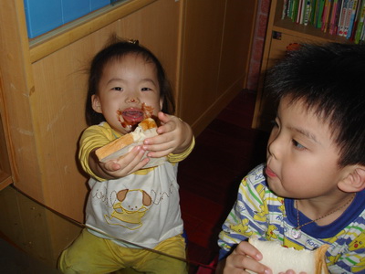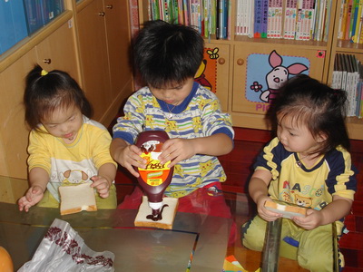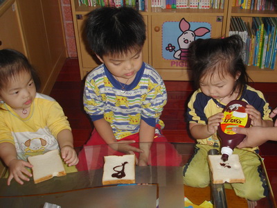 前陣子,看公共電視製作的學習ABC的DVD,裡面有教寫ABC筆順的部份,是用蕃茄醬或巧克力醬在吐司麵包上寫字,寶寶就一直吵著假日吃早餐時,也要如法炮製。其實不是很想讓他們這樣做,因為一想到巧力克醬變成遊戲地擠來擠去,家中客廳又是布沙發,一定會很恐怖。但是星期五接寶寶放學回來時,他還一直問材料準備好了沒,看他如此期待,最後只好帶著他去麵包店買吐司、去超市買了巧克力醬。