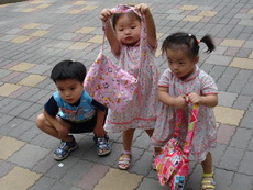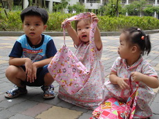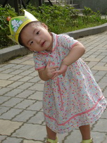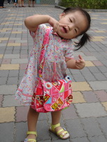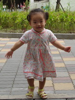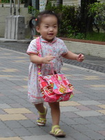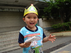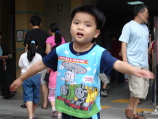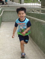 考完試的寶寶,飛奔過來,他很高興地展示子和色筆,看來這次考試對他來說,還很好玩哩。