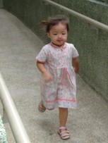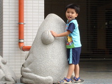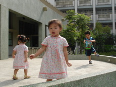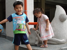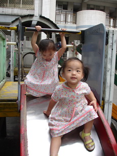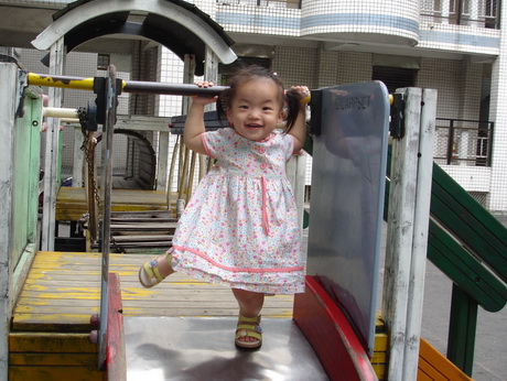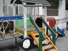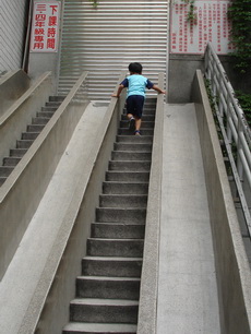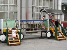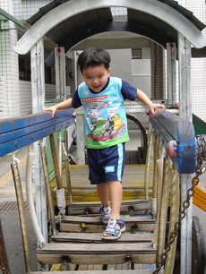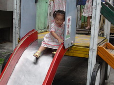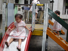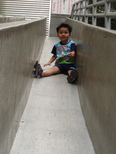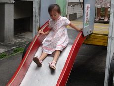 學校裡有一座大型的溜滑梯,好像是學生下課時用溜的方式下樓。因為太陡了,寶寶溜得有點害怕。