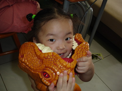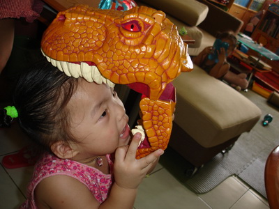 這隻恐龍玩具實在很耐玩,嚴格地講應該是『恐龍頭』很好玩。這組玩具是買給達哥的,原本是整組的風火輪激速軌道組,已經過了兩三年,所有的軌道、汽車等零件都已經損毀丟掉很久,只有這個恐龍頭一直留著,因為寶寶愛玩,後來蓉蓉也愛玩 (請參考兩年前的電子報─