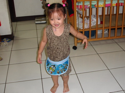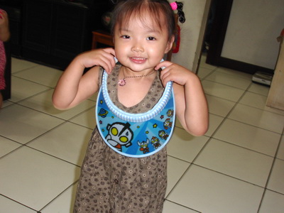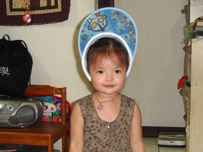 蓉蓉拿遮陽帽來戴,不過她大概認為遮陽是在外面大太陽時才用,在室內就不只是帽子的功能了…