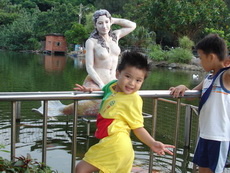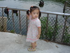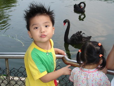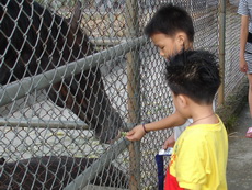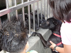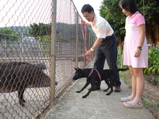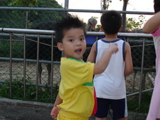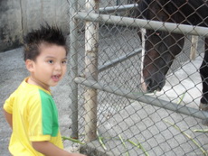 今天寶寶的幼稚園舉辦畢業典禮及成果發表會,晚上我們要出去吃飯時,因為珮瑜老師有幫寶寶梳帥帥的頭,還有灑上亮亮的粉,所以他就想維持這樣的打扮出門,因為時間緊迫,觀音山的包廂訂不到,臨時決定到台灣山豬城吃飯。到的時間已經是傍晚,趁著天氣還亮,我們先去看看動物。姨父養的狗Boogie第一次看到豬,嚇得皮皮挫。還看到三隻和自己一樣的台灣土狗,好像失散多年的狗兄弟一樣。
