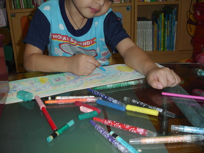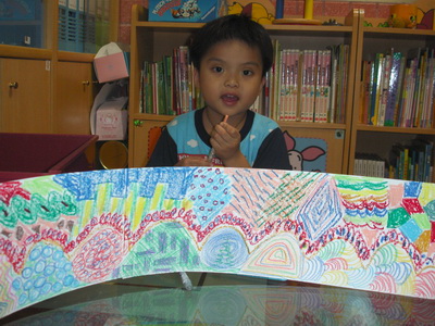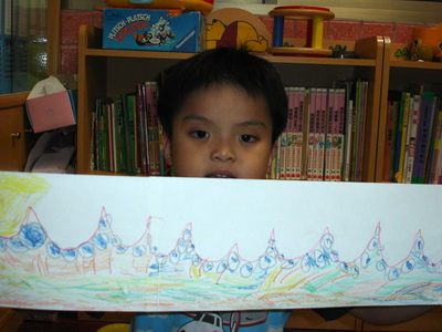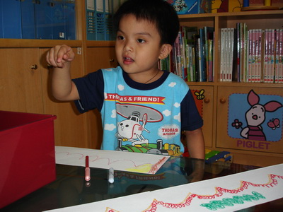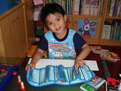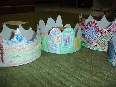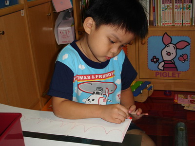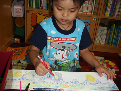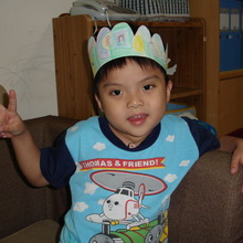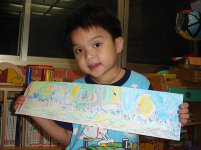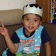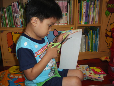 晚上寶寶又找爸爸一起來動手玩創意,他說要做皇冠,但是爸爸不知道皇冠怎麼做,家裡的書也沒寫過,電視上也沒教過,所以想必是在學校學到的,寶寶一直描述,就是先這樣…再這樣…。看他興緻頗高,爸爸也就聽他的指示,一步一步陪著做了。首先要準備長長的一條紙,要很長很長,於是將兩張 A4 的紙黏在一起,再裁成兩長條,寶寶和爸爸一人便負責一張。