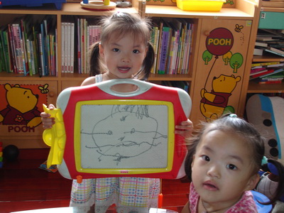 蓉蓉在客廳玩磁性畫板,也沒有特別去注意她在畫什麼東西,因為之前蓉蓉玩這塊畫板都是隨便亂塗而已,但是這次她畫完後特別叫媽媽看,這才發現居然出現一個『看得懂』的畫,問她畫的是什麼?她說是貓。我們都覺得有點意外,因為之前蓉蓉畫的,若硬要說是畫,也只能當成抽象畫,而今已經能畫出完整具像的作品了。