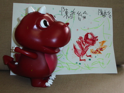 寶寶想要畫噴火龍,但一時不知道該如何畫,於是爸爸拿出噴火龍的公仔,要他看著畫畫。但是公仔擺在眼前時,寶寶還是不知道如何下筆。直到爸爸教他,拿一張白紙遮住身體,只看著頭來畫;再遮住頭,只看腳來畫腳…依此類推,寶寶大概體會出來,說了聲會畫了,最後就完成他的噴火龍了。