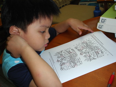 爸爸在玩解謎的遊戲,這是Google US Puzzle Championship 2006年題目裡的一題,是在兩張圖裡找不一樣的地方。比較特殊的是,這兩張圖是原圖和鏡像後的圖形,因此難度上又稍高了一點。