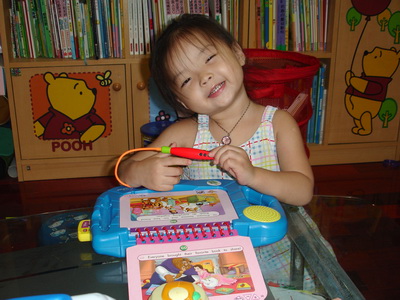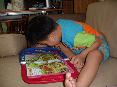 寶寶突然又想到要看 Lead Pad 的電子書,所以趁著小潔睡著之後,便讓寶寶和蓉蓉拿出來玩,因為這本書是會發出聲音,所以也都會引起小潔的興趣,但一來只有兩台電子書,二來小潔仍不會用,深怕在搶奪拉扯中把機器給弄壞了,所以只有等小潔睡著後才得以拿出來玩。