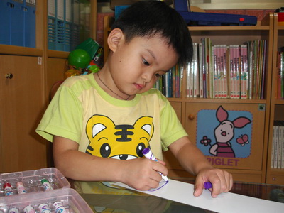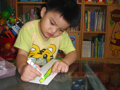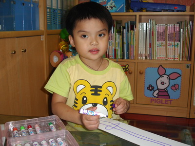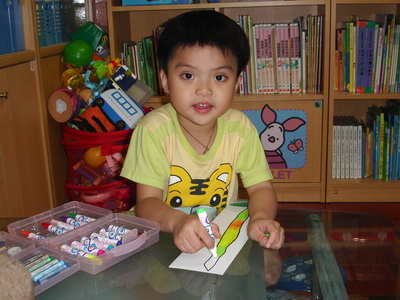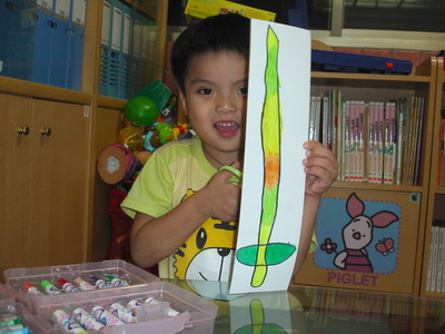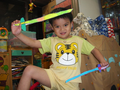 小孩子就是喜歡玩刀呀、槍呀。不過我們都不買這一類的玩具,因為他一直吵著要做劍,想想是美勞嘛,就讓他自由發揮了。
