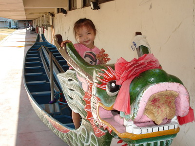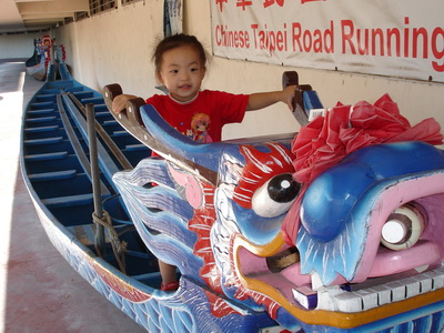 平常只在端午節比賽時看過龍舟,而且是遠遠地看它在河上,今天恰好看到停在陸地上的龍舟,很好奇地和它照張相。其實,好奇的是爸爸啦,要把蓉蓉和小潔抱上龍舟時,一開始她們還很害怕而不肯呢。