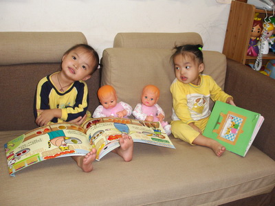 蓉蓉和小潔看書,兩人同時坐在沙發上,還有兩個小娃娃陪著。通常小潔都是模仿蓉蓉,看蓉蓉做什麼,她就要跟著做;蓉蓉玩什麼,小潔就跟著玩。也就因此,兩個人常常戴一樣的表 (有兩隻),搧一樣的扇子 (有兩把),吹一樣的哨子 (有兩個)…哎,明明就不是雙胞胎,偏偏很多玩具在家裡都得有相同的兩份。至於坐在兩人中間的小娃娃呢?也是一模一樣的兩個,不過這次就不是小潔跟著蓉蓉模仿了。因為這是小潔非常喜愛的娃娃,蓉蓉對它就顯得比較沒什麼緣份。打從阿姨送給兩姐妹的第一天,小潔就時常會抱著,反而是蓉蓉看到小潔玩,偶而才會拿來玩。