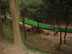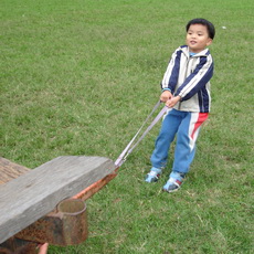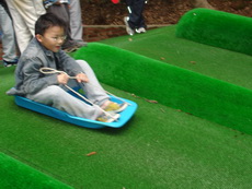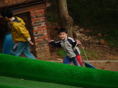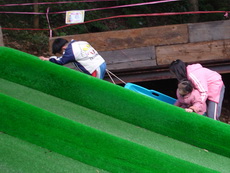 寶寶的玩法很特殊,只要看到達哥一滑下去,他就馬上從旁邊階梯往下衝,因為他是要去幫達哥把滑草板拿上來。真是奇怪,滑草的樂趣在於急速俯衝下去的快感,為了繼續玩,才不得不爬樓梯上來,下去很舒服,上來就很累了。偏偏寶寶是不敢滑下去,他只要走下去,再把滑草板拿上來。