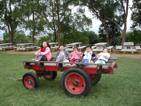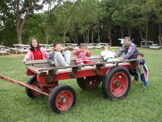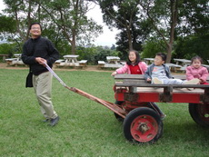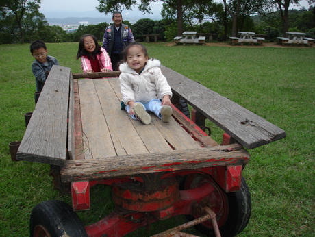 因為只有達哥一個人在滑,阿姨覺得太累了就喊停。補充一下,阿姨不是擔心達哥滑太多次太累,而是擔心寶寶每次都下去幫忙拿滑草板上來,是寶寶會太累。至於達哥,意猶未盡,如果許可,達哥再滑一百次大概也不想停。接著再到牧場的草地上玩,這次看到了一台牛車,只有車子,沒有牛,只好爸爸當牛來拉車。